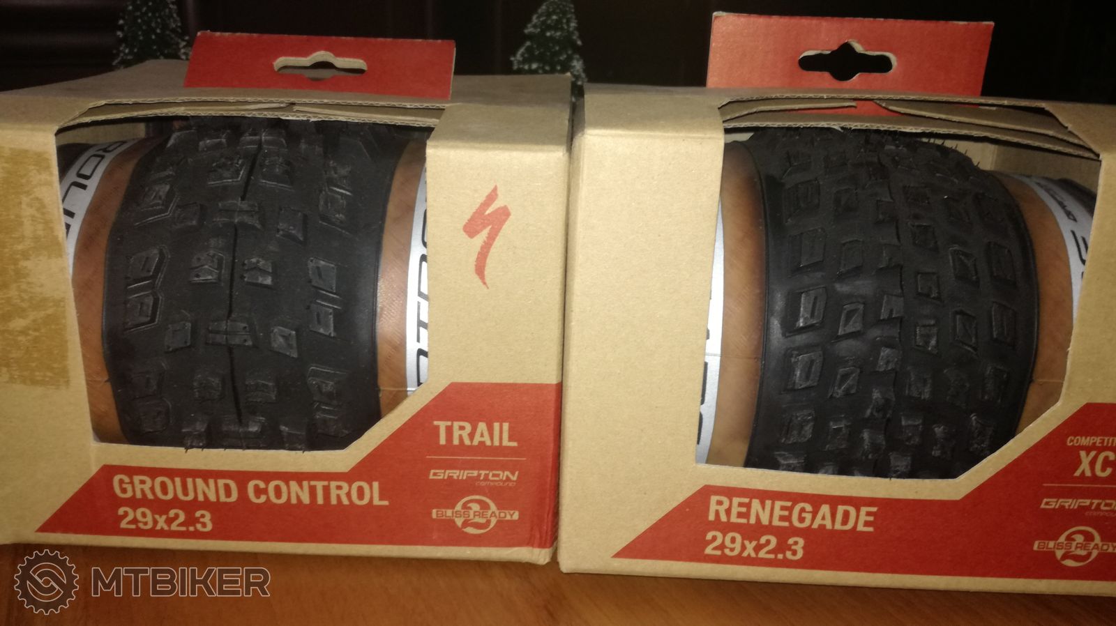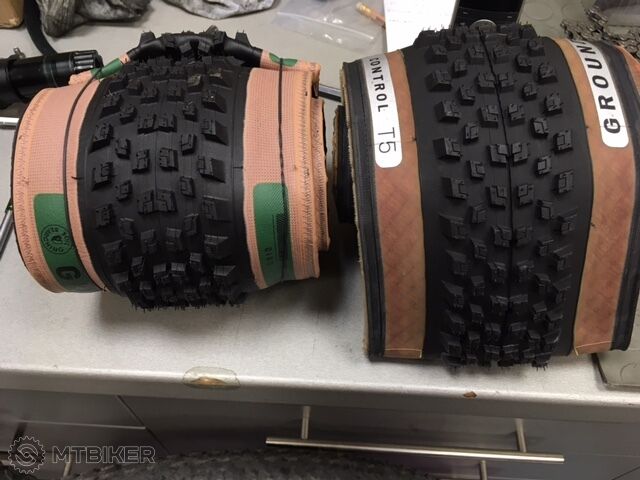 Ground control T5 s hnedou bocnicou uz nemali, tak som vzal ten starsi model, tiez ma slusny dezen (725g a 57mm na 30mm rafiku, 2 bary) a dozadu Renegade (650g a 56,5mm), odvazene, odmerane doma s dusami.