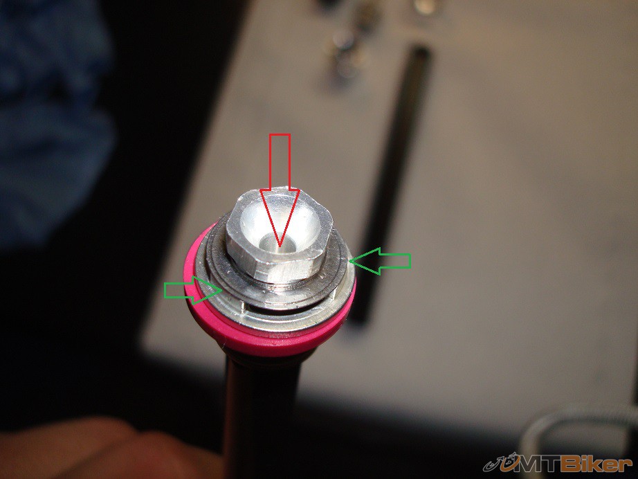 Červená šípka ukazuje na otvor kade vyteká olej pri klasickom low speed rebounde (pomalý odskok) a zelené šípky ukazujú tam, kde sú otvory pod planžetkami pre high speed rebound (rýchly odskok).