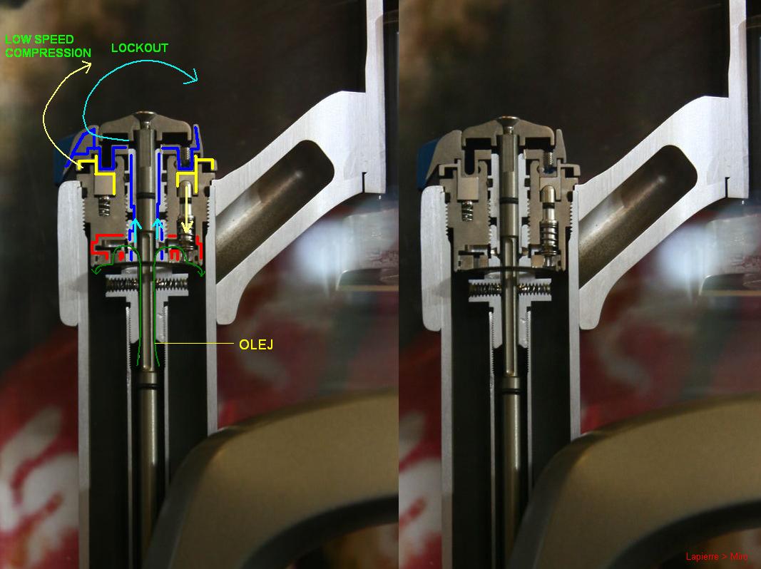 tie bledomodré šípky znázorňujú že pri pootočení kolečkom locku vlastne závit na 8-hrane (myslím že tam nieje 6 ale 8 hran) spôsobi posun celej "modrej" časti locku hore a tm sa obmedzí prietok oleja na minimum .. nakoľko ako si vyššie spomínal je o vlastne "kov na kov" a olej tade pomaly preteká .... olej znázorňujú len tmavozelené šípky a rebound jj ... aj rez spodonou časťou RLc patrony som našiel no netreba to tu zahltiť fotkami