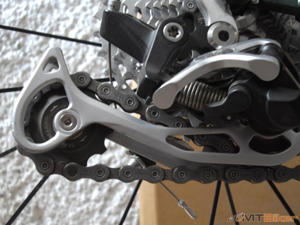 Tak ešte pár ilustračných obrázkov: na prvom je vidieť, že mám príliš dlhú reťaz - pružina prehadzovačky je totálne uvoľnená a reťaz sa dotýka hornej kladky. Teda teoreticky, lebo prakticky sa ten prevod nejazdí, takže je to jedno. Na druhom obrázku je vidieť maximálne napnutie pružiny prehadzovačky. Niektorí ľudia však kľudne vozia ramienko smerujúce skoro rovno dopredu - tiež to ničomu nevadí, len je pružina viac namáhaná. Preto som písal, že si to môžeš potuniť tak, ako to vyhovuje Tebe. Moje dôvody som písal - nižšia záťaž pružiny prehadzovačky, rezerva pri prípadnej oprave reťaze a teoreticky dlhšia životnosť reťaze. Z nevýhod možno to, že je reťaz menej napínaná, teda by mohla byť náchylnejšia na spadnutie - neviem, zatiaľ mi nespadla.