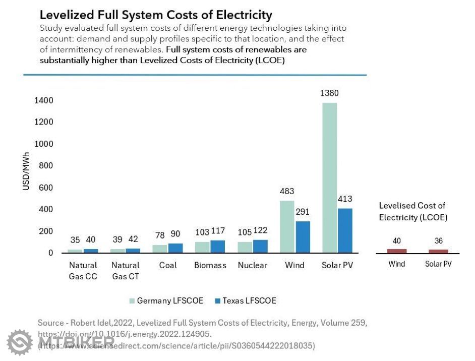 The LFSCOE-95 therefore calculates the LFSCOE under the relaxed assumption that only 95% of the annual average is provided by the main power source, and 5% are from such dispatchable sources. As you can see, this has a dramatic impact on the LFSCOE of renewables: They decrease by over 50%. In the calculations for Texas, it yields practically identical LFSCOE as nuclear (97 vs 96 $/MWh)!