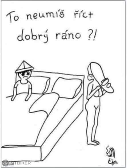Vzbudí se sousedova manželka a hned budí manžela. „Josefe, vstávej! On tě taky pomohl roztlačovat, když si měl vybitou autobaterii!“ Soused se tedy zvedne a jde na parkoviště. Nikde však svého souseda nevidí. „Sousede, kde jste?“ „Tady na houpačce!“